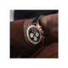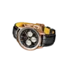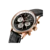 Crafted from 18k red gold, the 44mm case features the iconic Chronomat design: a unidirectional rotating bezel with rider tabs, screw-down crown, and sharply polished lines. The black dial provides contrast and clarity, with luminous hands and markers ensuring legibility in all conditions. Three chronograph sub-dials, located at 3, 6, and 9 o’clock, support a host of timing functions — all powered by Breitling’s in-house Caliber B01 automatic movement, boasting COSC certification and a robust 70-hour power reserve.