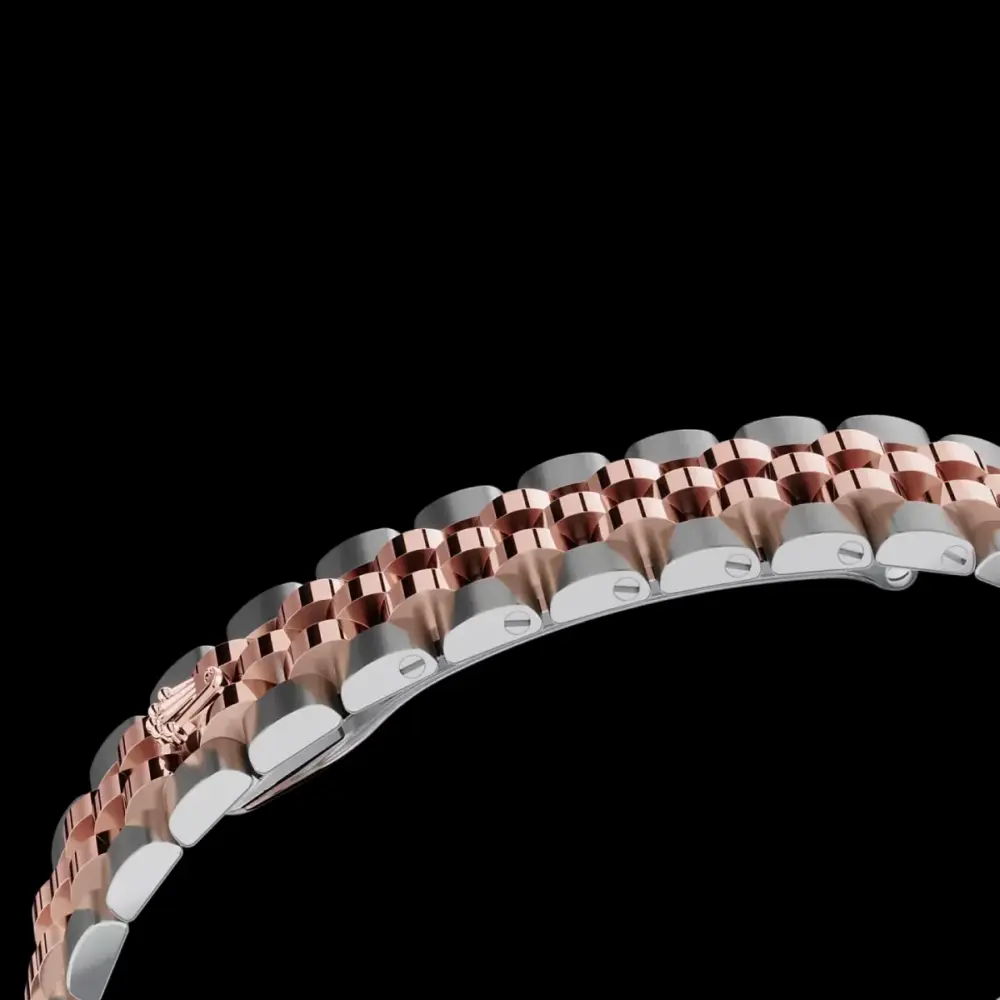Securely fastened by a Jubilee bracelet in Everose Rolesor with five-piece links and a concealed Crownclasp featuring the Easylink 5 mm comfort extension, the watch balances flexibility and elegance. Protected by a scratch-resistant sapphire crystal with Cyclops date lens, and water-resistant to 100 m, it promises both beauty and practicality.