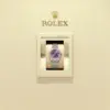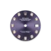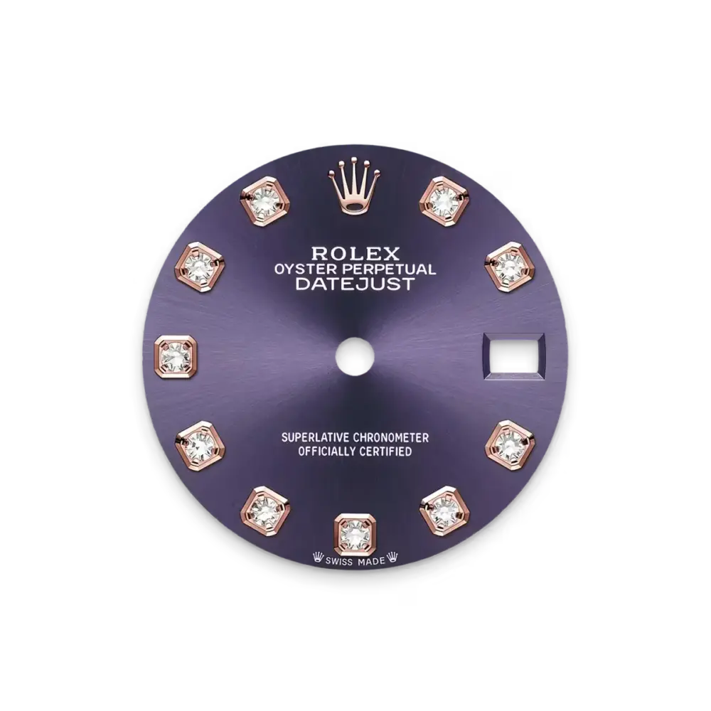 Its 28 mm Oyster case is topped with a fixed diamond-set Everose-gold bezel, offering subtle sparkle that complements the deep purple dial. The sunray finish enhances light play, adding depth to the aubergine hue, while diamond-set indices framed in Everose gold add understated elegance.