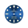 The vivid royal blue dial complements the bezel perfectly, featuring large Chromalight hour markers and hands filled with long-lasting blue luminescence for excellent legibility in dark underwater conditions. The classic Submariner layout includes a date display at 3 o’clock, magnified by the Cyclops lens for easy reading.